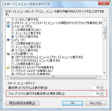 「ジャンプリストに表示する最近使った項目の数」を確認し「0」以外の数値に変更する