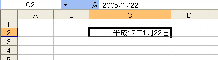 TEXT関数を使って「2005/1/22」を「平成17年1月22日」と表示するには、「=TEXT("2005/1/22","ggge年m月d日")」とします。下図は今後の展開を考えて、セルC2の配置を右揃えにしています。TEXT関数が返すのは文字列ですから、実際には左揃えで表示されます。