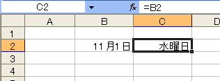 これで別のセルに曜日だけを表示できました。しかし、B列の日付とC列の曜日は連動していません。別のセルに、別の日付を入れているからです。これでは不便です。B列の日付を変更したときC列の曜日も自動的に変更されるようにするには、C列に