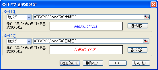 同じように、もう一つ「=TEXT(B2,"aaaa")="日曜日"」という条件付き書式を追加してやれば、日曜日の色を変えることも可能です。