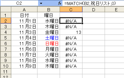 11月1日は祝日リストに含まれていませんから、"見つからなかった"という意味で「#N/Aエラー」が返りました。この数式をセル範囲C3:C10にコピーします。