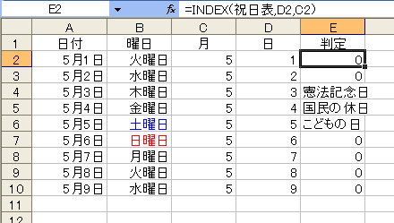 ある範囲(マトリックス)から、列と行を指定して交差するセルを調べるにはINDEX関数を使います。セルD2には「=INDEX(祝日表,D2,C2)」という数式を入力して10行目までコピーしました。