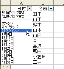[日付]列の▼(オートフィルタ矢印)をクリックしても「1月」や「2月」などの選択項目は表示されません。こんなときは[(オプション)]を実行します。