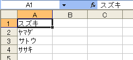 「スズキ」と「サトウ」は全角、「ヤマダ」と「ササキ」は半角のカタカナとして入力されています。全角のカタカナと英数字を半角に変換するには