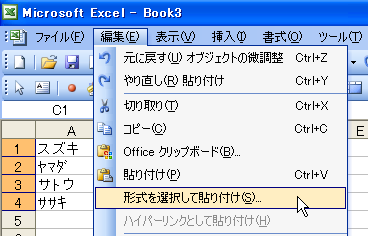 コピー元のC列を選択して[コピー]ボタンをクリックし、貼り付け先のセルA1を選択したら、[編集]-[形式を選択して貼り付け]をクリックします。