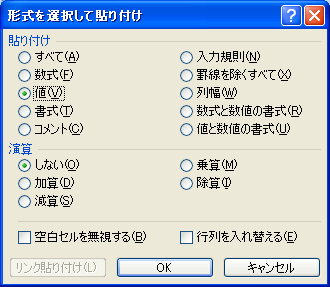 実行すると[形式を選択して貼り付け]ダイアログボックスが表示されますので、[値]チェックボックスをオンにして[OK]ボタンをクリックします。