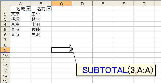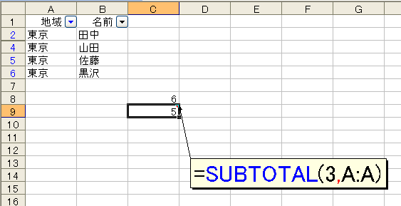 A列を「東京」で絞り込むと、SUBTOTAL関数の結果も変化します。