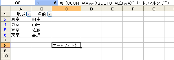 =IF(COUNTA(A:A)<>SUBTOTAL(3,A:A),"オートフィルタ","")