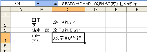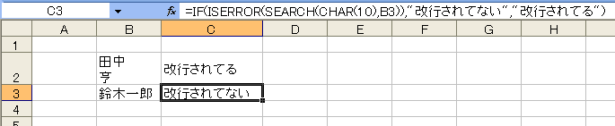 =IF(ISERROR(SEARCH(CHAR(10),B3)),"改行されてない","改行されてる")