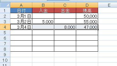 前日の残高に入金を加えて、出金を引いたのが新しい残高です。
