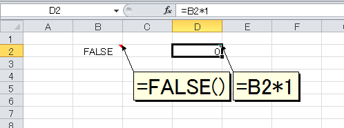 セルB2にTRUE関数を入力しました。そのセルB2を「×1」すると、計算結果は「