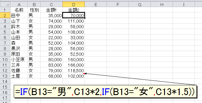 下図のような表があります。性別が"男"のときは「金額1×2」を金額2に入力し、性別が"女"のときは金額2に「金額1×1.5」を計算するものとします。普通にIF関数でやるなら、次のようになります。