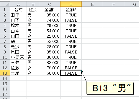 これは「セルB2が"男"である」という意味ですので、それが正しいときはTRUEが返ります。セルD2をセルD13までコピーすると、性別が"男"の行だけTRUEになるのがわかります。