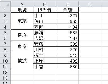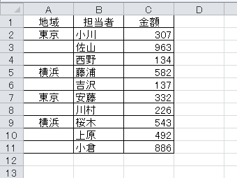 望む結果は違いますよね。でも、しかたないんです。結合されたセルでは、すべてのセルに同じデータが入力されているのではなく、左上のセルだけにデータが入力されています。つまり、本当はこういう表なんです。