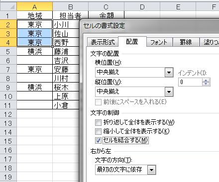 つまり、セルを結合すると、結合したセル範囲内の、
