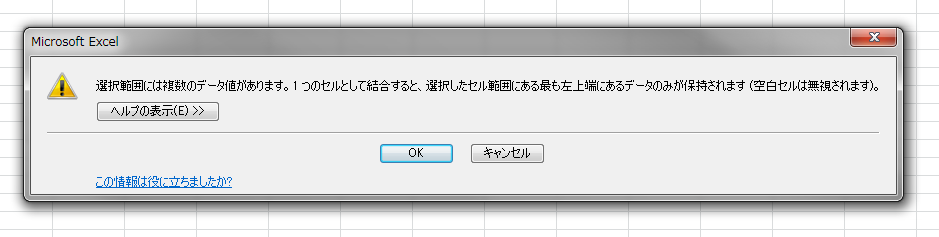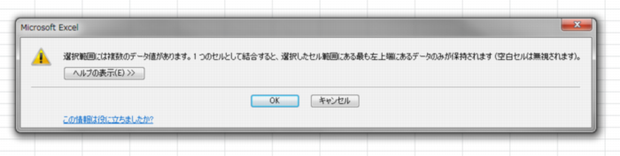 選択範囲には複数のデータ値があります。1つのセルとして結合すると、選択したセル範囲にある最も左上隅にあるデータのみが保持されます (空白セルは無視されます)。