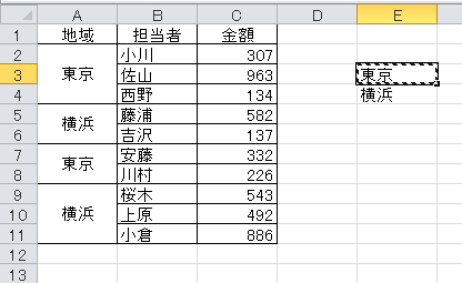 1.任意のセルに、埋め込みたいデータ(ここでは「東京」と「横浜」)を入力します