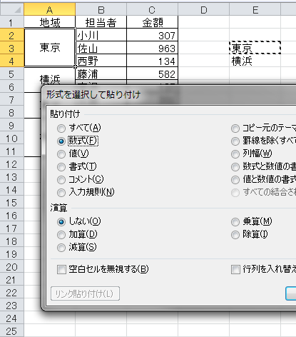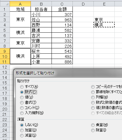 3.埋め込みたい結合セルを選択して[形式を選択して貼り付け]を実行します