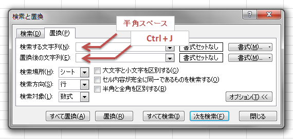 - [検索と置換]ダイアログボックスを開き、[検索する文字列]ボックスに半角スペースを入力し、[置換後の文字列]ボックスではCtrl + Jを押します。どちらも表示されませんので、注意深く入力してください。なお、[検索と置換]ダイアログボックスでは、前回指定した文字列が残りますので注意が必要です