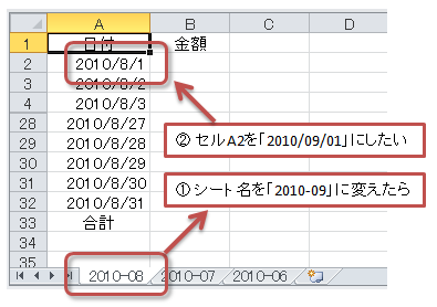 つまり、こういうことでした。前月のシート(たとえば[2010-08])をコピーして今月のシート(たとえば[2010-09])を作ると、セルA2の日付が自動的にその月の1日(たとえば"2010/09/01")にならないかと。
