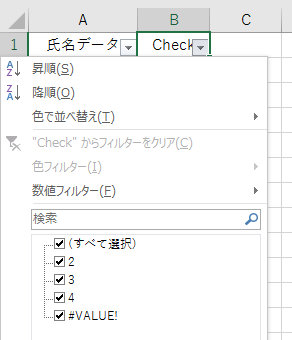 B列に「=FIND(" ",A2)」のような数式を入れ、フィルハンドルをダブルクリックして、一番下までコピーします。そして、B列にオートフィルタを設定します。