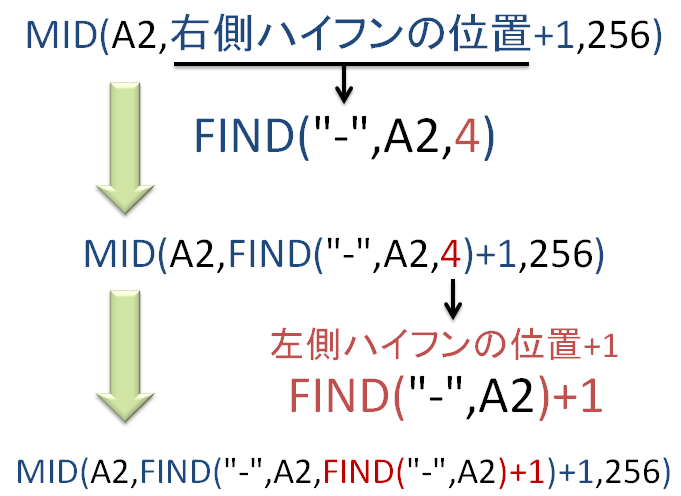 抜き出すのは、ハイフン(-)の右(4文字目)から後ろ全部ですから、次のように