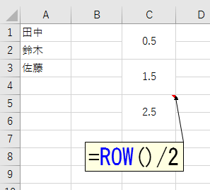 あれ?いきなり、なんかイイ感じになりましたよ。ROW関数を2で割ると、