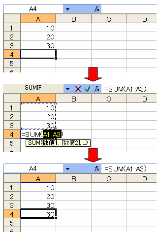 たとえば、下図のようなワークシートで、セルA4にSUM関数を入力してみます。