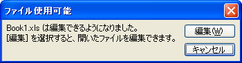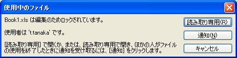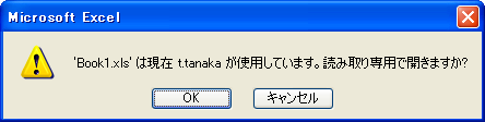 共有ブックではない普通のブックを、すでに誰かが開いていたとき、その同じブックを手動で開こうとすると、次のような確認メッセージが表示されます。