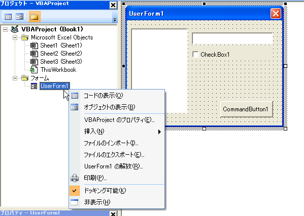 UserFormを挿入し、適当にコントロールを配置します。プロジェクトエクスプローラでUserFormを右クリックして[ファイルのエクスポート]をクリックします。