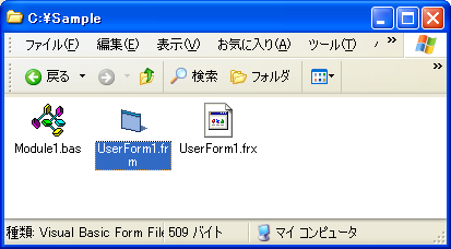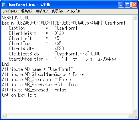 もうひとつの「UserForm1.frx」はバイナリ形式ですので、メモ帳などでは閲覧できません。こちらの「UserForm1.frx」に、コントロールの位置などが記録されています。