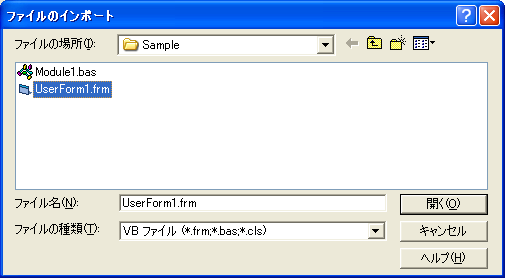 プロジェクトエクスプローラ内で右クリックし、[ファイルのインポート]を実行します。表示されるダイアログボックスで[UserForm1.frm]を選択して[開く]ボタンをクリックします。