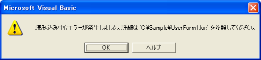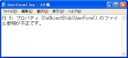そんなに怒らなくてもいいじゃないすか。ちょっとイタズラしただけなのに。ったく冗談が通じませんね。「メモリが不足」って、そりゃ関係ないでしょ。で、そのエラーを記録したという「UserForm1.log」を見ると、次のように記録されています。