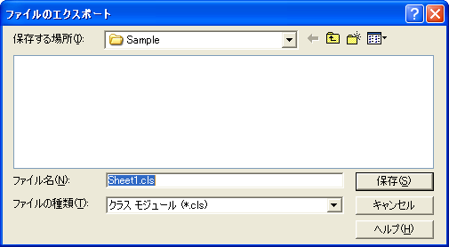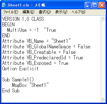 エクスポートされたクラスモジュールの中(上図)を見るとわかりますが、記録されるのは、当然ですが、作成したプロシージャなどモジュールに関する情報だけです。Sheet1モジュールをエクスポートしたからといって、ワークシートに入力したデータなどは記録されません。