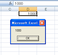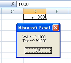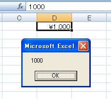 セルに「\」記号と3桁区切りの表示形式を設定しました。セルには「\1,000」と表示されています。この状態でもValueプロパティは、あくまで