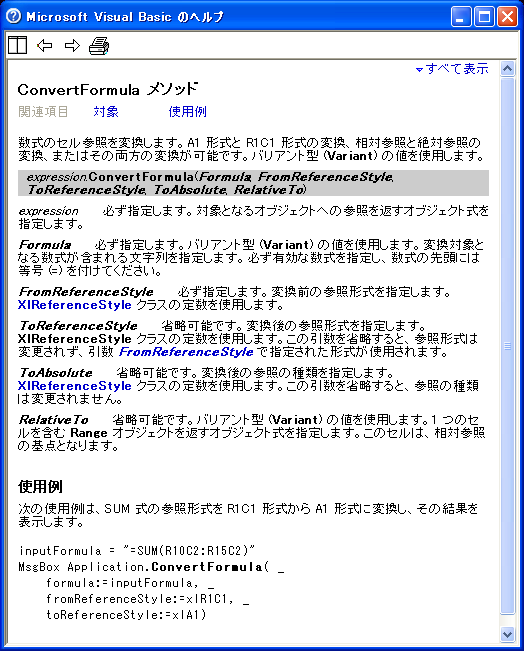 相対参照形式と絶対参照形式の変換」を指定できません。参考までに、VBEのオブジェクトブラウザで定数を調べてみましょう。