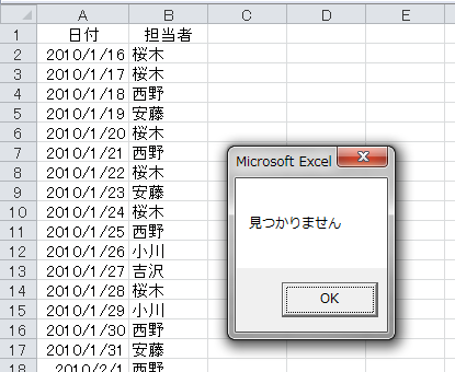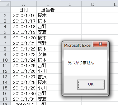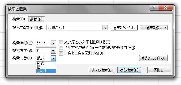 Set FoundCell = Range("A:A").Find(What:="2010/1/24") ''オプションを何も指定していない