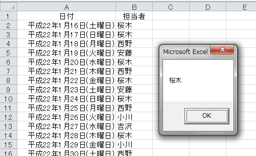 Set FoundCell = Range("A:A").Find(What:="平成22年1月24日(日曜日)", LookIn:=xlValues)