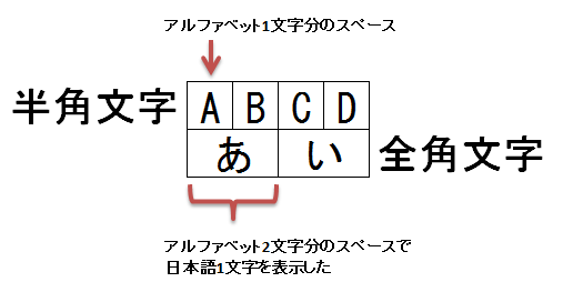 日本語を基準に見たとき、アルファベットは日本語の"半分"の幅で表示されることから、アルファベットや数字などを「半角文字」と呼び、コンピュータの世界では、本当はそっちの方がイレギュラーだった日本語を「全角文字」と呼びました。