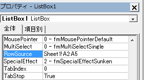 UserFormのデザイン段階で、[プロパティ]ウィンドウの[RowSource]プロパティに「Sheet1!A2:A5」と設定します。すると、デザイン段階で、リストボックスにはワークシートのデータが反映されます。