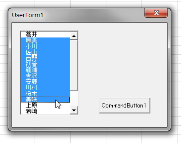 リストボックスで複数の項目を選択可能にするには、リストボックスのMultiSelectプロパティを設定します。標準では「fmMultiSelectSingle」が設定されています。