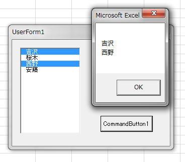 複数選択可能なリストボックスで、どの項目が選択されているかは、TextプロパティやValueプロパティでは調べられないので、少しめんどうな方法を使わなければなりません。