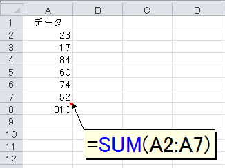 A列には全部で6個の数値が入力されていて、最終セルの「52」はセルA7です。このように数値が入力されている表の最終行にSUM関数を挿入してみましょう。つまり、次のような感じです。