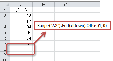 - SUM関数を挿入するセル → Range("A2").End(xlDown).Offset(1, 0)