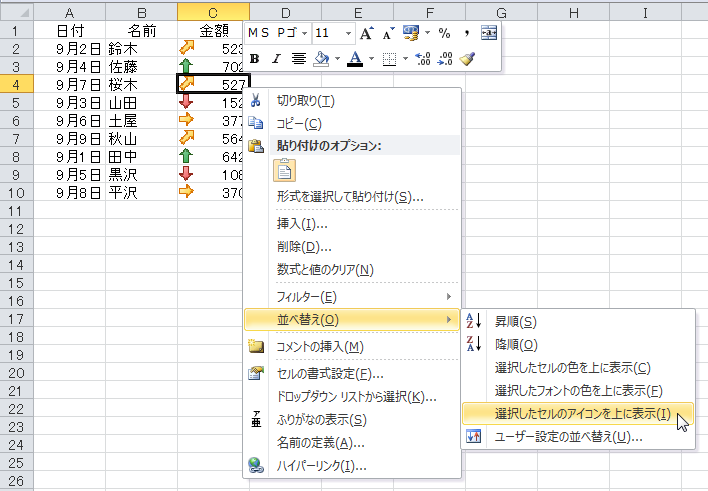 4.任意のセル(ここではセルC4)を右クリックして、アイコンで並べ替えます