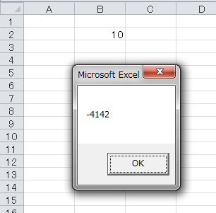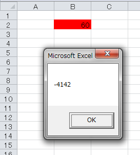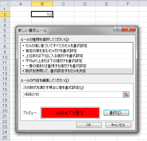 「-4142」は、セルの背景色が「色なし」であることを示す、定数xlNoneの数値です。では、このセルに条件付き書式を設定してみましょう。もし、セルB2の値が50より大きかったら、背景色を赤色にするという条件付き書式です。