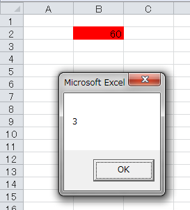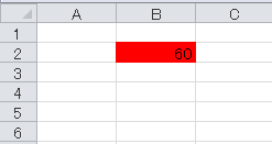 この状態で、セルB2に「60」と入力すれば、もちろん条件付き書式によって、セルの背景色が赤色に変わります。