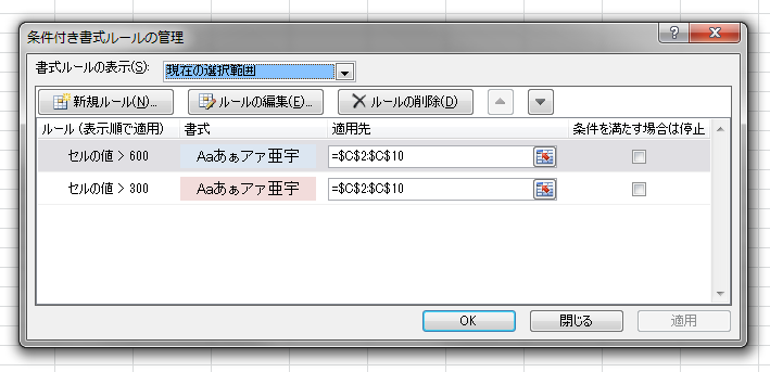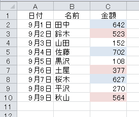 次は、色で並べ替えます。下図の表は、C列に条件付き書式を設定しています。