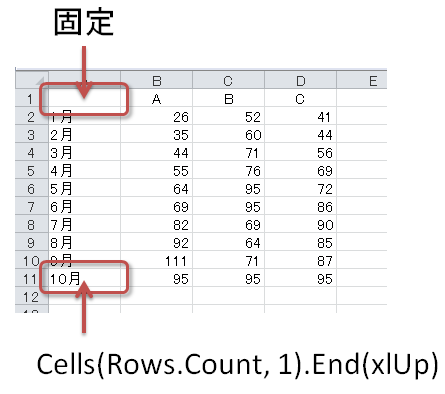 A列の最終セルの1つ上 = Cells(Rows.Count, 1).End(xlUp).Offset(-1, 0).Address