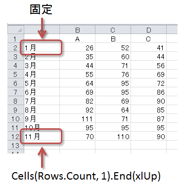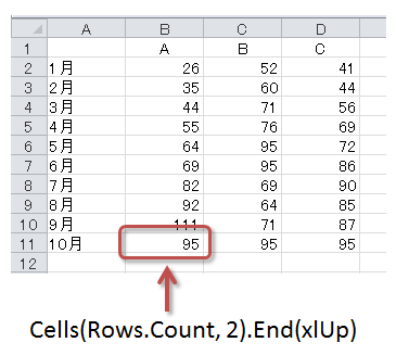 B列の最終セルの1つ上 = Cells(Rows.Count, 2).End(xlUp).Offset(-1, 0).Address